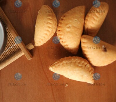 面粉用沸水燙成熟面,與糯米粉揉勻成粉團,搓條,摘劑,掀成皮子。將細豆沙餡,豬板油丁和糖分別包入皮子,對折成半月形餃子,放入油鍋,炸至金黃色撈起。